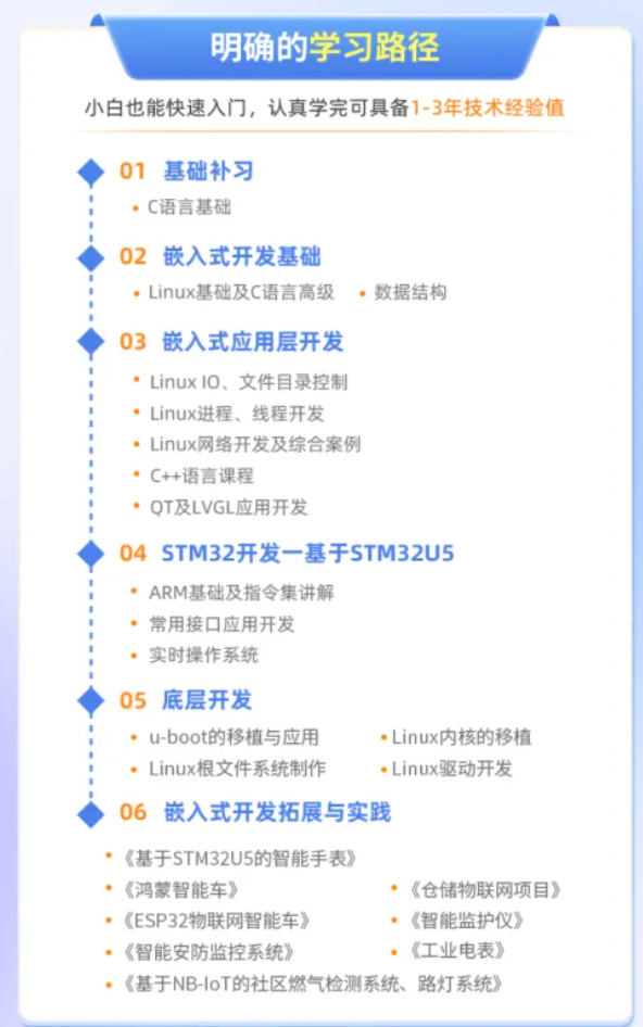 華清遠(yuan)見(jian)推(tui)出了一流嵌入式高(gao)薪(xin)就業課(ke)程(cheng),為零基礎小白(bai)、技(ji)術轉(zhuan)型(xing)人(ren)群、在職提升者還(huan)有跨行轉(zhuan)專業的人(ren)配置了合適的全流程(cheng)技(ji)術成長路線。