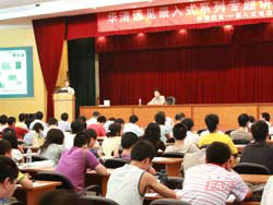 | 圖三、周明老師熱情解答與會者技術問題 | 圖四、黃昕老師專題講座中 |