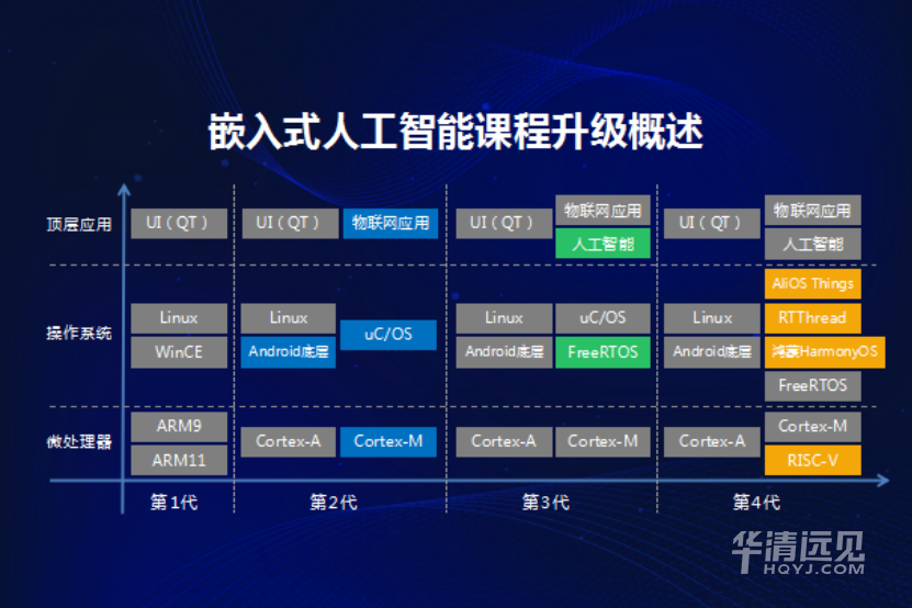 2021年,華(hua)清(qing)遠見不僅完(wan)成了(le)品(pin)牌升(sheng)(sheng)級(ji)(ji),也(ye)將核(he)心(xin)(xin)課(ke)程(cheng)(cheng)進(jin)行了(le)全面升(sheng)(sheng)級(ji)(ji)。升(sheng)(sheng)級(ji)(ji)后的(de)(de)(de)(de)(de)嵌(qian)入式AI課(ke)程(cheng)(cheng)中,微處(chu)理器增加了(le)最(zui)新的(de)(de)(de)(de)(de)RISC-V,開發(fa)課(ke)程(cheng)(cheng)新增AliOS Things、RT-Thread、鴻蒙HarmonyOS三(san)大(da)熱門(men)系統(tong)的(de)(de)(de)(de)(de)學(xue)(xue)習,頂(ding)層運用(yong)課(ke)程(cheng)(cheng)則包含UI(QT)、物聯網應用(yong)、人(ren)(ren)工智能三(san)大(da)板(ban)塊(kuai),全方位(wei)提升(sheng)(sheng)學(xue)(xue)員的(de)(de)(de)(de)(de)核(he)心(xin)(xin)競爭力。課(ke)程(cheng)(cheng)在(zai)(zai)研(yan)發(fa)中聚焦學(xue)(xue)員就業(ye)崗位(wei)及薪(xin)酬,針(zhen)對性升(sheng)(sheng)級(ji)(ji)了(le)50%的(de)(de)(de)(de)(de)學(xue)(xue)科內容(rong),同(tong)時(shi)針(zhen)對在(zai)(zai)職(zhi)人(ren)(ren)群,線上學(xue)(xue)習線下實(shi)戰的(de)(de)(de)(de)(de)新模式,解決了(le)在(zai)(zai)職(zhi)學(xue)(xue)員的(de)(de)(de)(de)(de)學(xue)(xue)習時(shi)間碎片化(hua)(hua)的(de)(de)(de)(de)(de)難題。此次升(sheng)(sheng)級(ji)(ji)緊隨行業(ye)技術(shu)前沿,滿足(zu)學(xue)(xue)員多元化(hua)(hua)需(xu)求(qiu)。同(tong)時(shi)華(hua)清(qing)遠見匯聚了(le)國(guo)內最(zui)頂(ding)尖的(de)(de)(de)(de)(de)IT行業(ye)資深專家和技術(shu)精英,擁有核(he)心(xin)(xin)的(de)(de)(de)(de)(de)技術(shu)研(yan)發(fa)力量(liang)和強大(da)的(de)(de)(de)(de)(de)教學(xue)(xue)資源,為廣大(da)用(yong)戶(hu)提供(gong)個性化(hua)(hua)、實(shi)戰化(hua)(hua)、智能化(hua)(hua)的(de)(de)(de)(de)(de)卓越在(zai)(zai)線學(xue)(xue)習體驗。