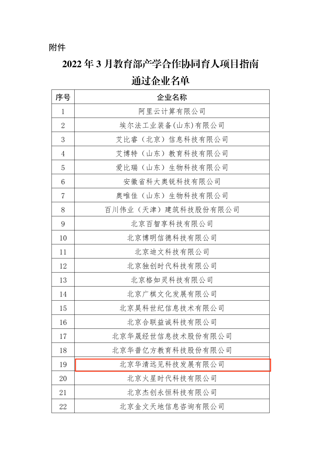 日前,“關于(yu)公布(bu)教育部(bu)產學(xue)合(he)(he)作協(xie)同育人(ren)項(xiang)目指南通過企業(ye)名單(2022年(nian)(nian)3月)的通知"發(fa)布(bu),北京華(hua)清(qing)遠(yuan)見科技發(fa)展有限公司通過評審,成為2022年(nian)(nian)教育部(bu)產學(xue)合(he)(he)作協(xie)同育人(ren)項(xiang)目合(he)(he)作企業(ye)。