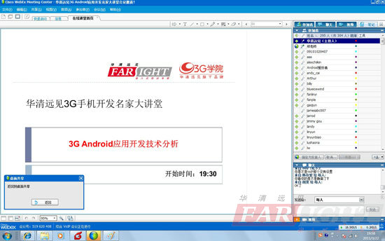 為了讓更多(duo)Android技術開(kai)發(fa)愛好者能夠(gou)獲得與鄭老(lao)師直(zhi)(zhi)接(jie)進行技術交流的(de)機會,華(hua)清遠見專門(men)在(zai)本次3G名家大講(jiang)堂中(zhong)安(an)排了android應用以(yi)及系統內核(he)開(kai)發(fa)技術講(jiang)座,該(gai)講(jiang)座采(cai)用網絡直(zhi)(zhi)播方(fang)式,由鄭萌老(lao)師結合(he)多(duo)年Android開(kai)發(fa)經驗(yan),親(qin)自承擔分(fen)享android應用以(yi)及系統內核(he)開(kai)發(fa)中(zhong)的(de)關鍵技術要點(dian)。由于采(cai)用了先進的(de)無地(di)(di)域(yu)界限、實時互動(dong)的(de)專業(ye)技術交流平臺,所(suo)以(yi)在(zai)本次活動(dong)中(zhong)來(lai)自北京、上海、東北、湖南、江蘇、福建、廣(guang)東、廣(guang)西等各個地(di)(di)區的(de)朋(peng)友都真正實現了近距離(li)、實時與業(ye)內頂(ding)尖高手(shou)相(xiang)互過招、共同切(qie)磋的(de)機會。
