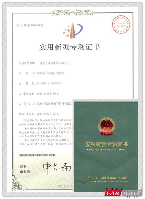 2016年8月,由華清遠見(jian)研發(fa)中心自主研發(fa)的(de)“一種嵌入(ru)式(shi)物(wu)聯網(wang)實(shi)(shi)驗平(ping)臺”(物(wu)聯網(wang)實(shi)(shi)驗平(ping)臺FS_WSN4412)榮獲國家知(zhi)識產權(quan)局(ju)頒發(fa)的(de)《實(shi)(shi)用新型(xing)專(zhuan)利證書(shu)》。這標志著華清遠見(jian)在物(wu)聯網(wang)實(shi)(shi)驗領域取得了進一步的(de)發(fa)展,實(shi)(shi)現了從(cong)實(shi)(shi)驗到實(shi)(shi)用產品的(de)過渡。
