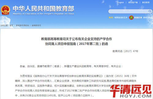 10月份(fen),教(jiao)(jiao)育(yu)部高(gao)等教(jiao)(jiao)育(yu)司(si)公布了2017年第(di)二批(pi)產(chan)學合作(zuo)協同育(yu)人項(xiang)目獲(huo)批(pi)立頂的(de)(de)(de)企業(ye)情(qing)況。其中,華清遠見教(jiao)(jiao)育(yu)集(ji)團申報的(de)(de)(de)4個項(xiang)目(教(jiao)(jiao)學內(nei)容與課程體(ti)系改革、師資培(pei)訓(xun)、實(shi)踐(jian)條件(jian)建設、大學生實(shi)習實(shi)訓(xun))成功獲(huo)得審批(pi),為進一步(bu)深入開展產(chan)學合作(zuo)提供了新的(de)(de)(de)平(ping)臺和契(qi)機,實(shi)現了通過校企共(gong)建達到產(chan)教(jiao)(jiao)融合,共(gong)同培(pei)育(yu)企業(ye)急(ji)需(xu)實(shi)用人才的(de)(de)(de)目標(biao),有效地(di)提升了大學生創新創業(ye)能力。