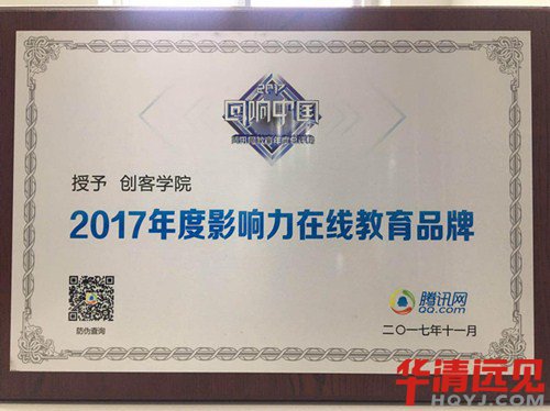 2017年(nian)(nian)(nian)11月22日,第十一屆“回響(xiang)中(zhong)國”騰訊網(wang)教(jiao)(jiao)育年(nian)(nian)(nian)度(du)總評榜榮耀盛(sheng)典(dian)在首都北京(jing)中(zhong)國大飯(fan)店隆重(zhong)舉行(xing)。華清遠(yuan)(yuan)(yuan)見(jian)憑借其14年(nian)(nian)(nian)的(de)(de)(de)行(xing)業專(zhuan)注(zhu)度(du)、雄厚的(de)(de)(de)研發能(neng)力(li),優(you)質的(de)(de)(de)師資,適應企業需求的(de)(de)(de)課程內(nei)容等獨特優(you)勢,榮獲“2017年(nian)(nian)(nian)度(du)影(ying)響(xiang)力(li)教(jiao)(jiao)育品牌 ”這(zhe)一項(xiang)大獎。此(ci)獎項(xiang)的(de)(de)(de)獲得(de)是(shi)業內(nei)給予華清遠(yuan)(yuan)(yuan)見(jian)十三年(nian)(nian)(nian)發展最好的(de)(de)(de)肯定,也是(shi)華清遠(yuan)(yuan)(yuan)見(jian)前進的(de)(de)(de)動(dong)力(li)。