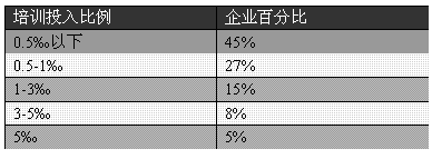 在參加培訓的學員中,自費參加培訓的占60%以上,公費的約占40%。據統計,雖然公司是否提供培訓機會被每一名求職者關注,但IT企業在員工培訓經費的投入上普遍不足。下表顯示了各企業在員工培訓上所花的投入。可以看出,在培訓經費投入不到1‰的達到7成,這與一個飛速發展的產業不相適宜。