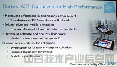 高性能(neng)(neng)產品用處理(li)(li)器Cortex-A57的主要(yao)特點:32位模式的性能(neng)(neng)為(wei)2012年(nian)的高性能(neng)(neng)智(zhi)能(neng)(neng)手機的3倍,電(dian)力效率為(wei)平板(ban)電(dian)腦和筆記本電(dian)腦的5倍。還通過配備新(xin)指令提(ti)高了加(jia)密(mi)處理(li)(li)速度。