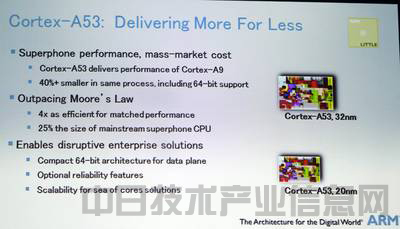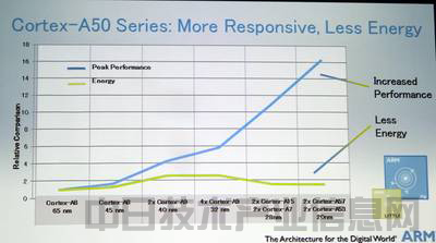 以高電力(li)效率(lv)為賣點(dian)的Cortex-A53。性能與現有的Cortex-A9相同,但裸片尺寸縮小了40%。制造工(gong)藝為32nm和20nm。 就(jiu)ARM等(deng)的(de)嵌入式(shi)處(chu)理(li)器支持64位(wei)處(chu)理(li)的(de)意(yi)義,Keith Clarke表(biao)示,“網絡和服務器支持64位(wei)處(chu)理(li)的(de)必要性不(bu)言自明。移動計算領域也(ye)(ye)出現了需(xu)要大容量存儲(chu)空間的(de)應(ying)用(yong),而且畫面的(de)高分辨(bian)率化(hua)不(bu)斷推進”,所以便攜終端也(ye)(ye)需(xu)要支持64位(wei)處(chu)理(li)。   作為兼顧低耗電(dian)(dian)量和高(gao)性(xing)(xing)能(neng)(neng)的技術,ARM發布了(le)裝有低耗電(dian)(dian)和高(gao)性(xing)(xing)能(neng)(neng)兩(liang)種內核,可相應(ying)于負(fu)荷(he)動態切換使用的“big.LITTLE”。據稱在A53和A57利用big.LITTLE,可以制成比以往峰值(zhi)性(xing)(xing)能(neng)(neng)高(gao)且耗電(dian)(dian)量低的芯片。Keith Clarke稱,采用A50系(xi)列的產品預計(ji)“將于2014年供貨”。