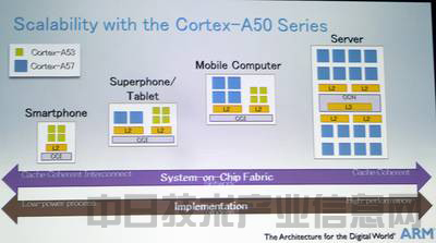顯示(shi)出了(le)A50系列(lie)可擴(kuo)展性的(de)構成示(shi)例。有智能(neng)手機用(yong)(yong)四核A53處理(li)器(qi)(qi),平板電腦用(yong)(yong)組(zu)合(he)了(le)雙核A57和(he)四核A53的(de)處理(li)器(qi)(qi)。向筆記本電腦將提供4個A57和(he)4個A53組(zu)合(he)的(de)高性能(neng)處理(li)器(qi)(qi)。向服務器(qi)(qi)將提供配備了(le)三級緩存(cun)、采用(yong)(yong)16個A57的(de)巨大處理(li)器(qi)(qi)。 ARM系統(tong)設計部(bu)門(men)高(gao)級副社(she)長兼總經理John Cornish介紹了針對服(fu)(fu)務器市場的(de)(de)舉措。服(fu)(fu)務器的(de)(de)用(yong)途和要(yao)求(qiu)多種多樣(yang),很(hen)難用(yong)一款(kuan)處理器全(quan)部(bu)涵蓋。ARM瞄準(zhun)的(de)(de)不是(shi)(shi)所有的(de)(de)服(fu)(fu)務器,而(er)是(shi)(shi)Web服(fu)(fu)務器和云(yun)等中低負荷(he)的(de)(de)用(yong)途。