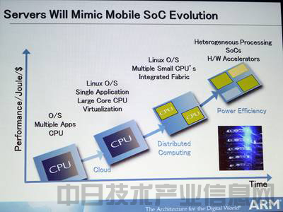 圖示為用ARM處(chu)理(li)器(qi)(qi)取代服(fu)務器(qi)(qi)用處(chu)理(li)器(qi)(qi)。左下方是(shi)以往的(de)處(chu)理(li)器(qi)(qi),用一個處(chu)理(li)器(qi)(qi)運行多個應用。右(you)側是(shi)虛(xu)擬化,然后是(shi)小型CPU內核(he)的(de)集(ji)合體。右(you)端是(shi)CPU內核(he)和加速器(qi)(qi)的(de)SoC(system on a chip)組合 John Cornish還指出:“現在(zai)很(hen)多服務器雖都使用(yong)高(gao)性(xing)能處理器,但利(li)(li)用(yong)率較低,大量電力(li)都白白浪費掉了。要提(ti)高(gao)利(li)(li)用(yong)率,需要復雜(za)的(de)虛擬化(hua)。”提(ti)供(gong)執行(xing)應用(yong)的(de)專用(yong)CPU,并對其加(jia)以整合(he)的(de)做(zuo)法(fa)效率較高(gao),所以“今后為滿足(zu)SNS等(deng)需求(qiu)而特別設計的(de)CPU、加(jia)上(shang)提(ti)高(gao)了特定處理速度的(de)加(jia)速器,由此組合(he)而成的(de)SoC(system on a chip)將會增加(jia)”。 熱點鏈(lian)接: