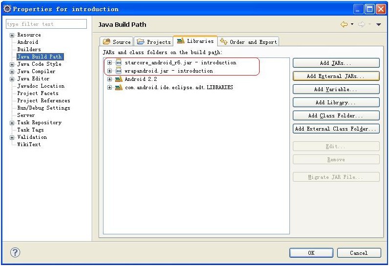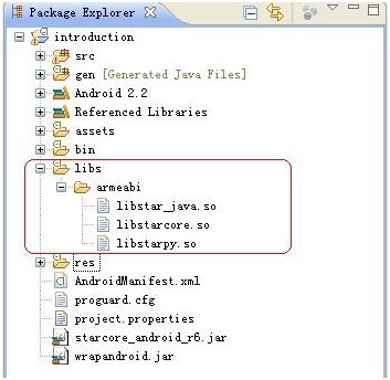 c. 將庫文件starcore_android_r6.jar和wrapandroid.jar到工程目(mu)錄(lu)下,將這兩個(ge)文件加入到工程中,如(ru)下圖: