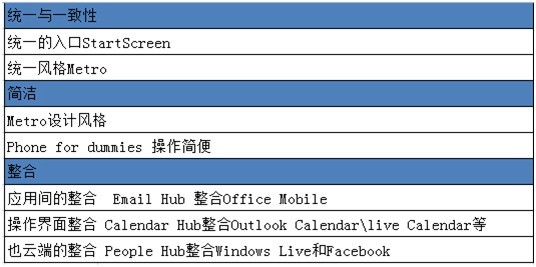 | Windows Phone是微軟發布的(de)新(xin)一(yi)代(dai)觸控操作模式的(de)智能手機操作系統,它將微軟旗下(xia)的(de)Xbox LIVE游戲、Zune音(yin)樂與(yu)獨特的(de)視頻體(ti)驗整(zheng)合(he)至手機中。做為MS新(xin)一(yi)代(dai)智能手機系統,Windows Phone有著(zhu)自己(ji)獨特的(de)功能特點(dian),具體(ti)如下(xia)表: