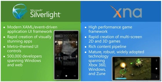 首先下載(zai)開發(fa)工具(WPDT)—>利用開發(fa)工具編寫相應的程序代碼(ma)并生成.xap文(wen)件—>在Windows Phone設備(bei)或模擬器上進行調試(shi)—>上傳到Marketplace由MS進行驗證(zheng),然后提供(gong)給(gei)客戶下載(zai),當程序更(geng)新后,通過MS的云服務,也會將(jiang)程序的更(geng)新信息提供(gong)給(gei)用戶。 1.開發平臺     Windows Phone的開發包括2大平臺,Silverlight平臺和XNA平臺