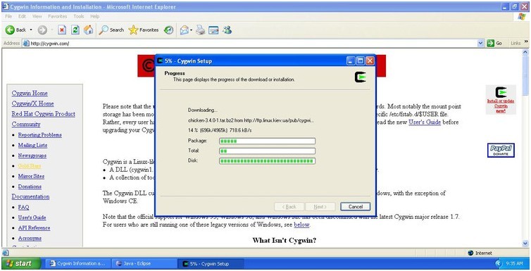 缺省地,只有base包(bao)(bao)會(hui)被(bei)安裝(zhuang)。我(wo)(wo)們則需要Devel包(bao)(bao)。不要去挑選(xuan)我(wo)(wo)們需要什么樣的包(bao)(bao),因為這樣有可能會(hui)導致包(bao)(bao)之間(jian)的依賴性喪(sang)失或者其(qi)他(ta)典型的Unix夢(meng)魘,所以(yi),我(wo)(wo)建(jian)議安裝(zhuang)整個Devel分(fen)支。分(fen)幾(ji)次單擊Devel根節點邊上的“Default”,直(zhi)到(dao)“Default”變成“Install”,就像上圖所示的那樣。 現(xian)在點擊(ji)Next按鈕,Cygwin就會下載選中(zhong)的軟件包(bao)并(bing)著手安裝: