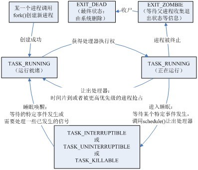 | 進(jin)程不但包括程序的(de)(de)指令和(he)數據,而且包括程序計數器(qi)(qi)和(he)處(chu)理器(qi)(qi)的(de)(de)所有寄(ji)存器(qi)(qi)及存儲臨時數據的(de)(de)進(jin)程堆棧,因此正在執行的(de)(de)進(jin)程包括處(chu)理器(qi)(qi)當前(qian)的(de)(de)一切(qie)活(huo)動。 因為Linux是一(yi)個(ge)多(duo)進(jin)程的操(cao)作系統,所以其他(ta)的進(jin)程必須等到系統將處(chu)理器(qi)(qi)使用權(quan)分(fen)配(pei)(pei)給(gei)自己(ji)之后才能運(yun)行(xing)。當正(zheng)在運(yun)行(xing)的進(jin)程等待(dai)其他(ta)的系統資源(yuan)時,Linux內核(he)將取得處(chu)理器(qi)(qi)的控制(zhi)權(quan),并將處(chu)理器(qi)(qi)分(fen)配(pei)(pei)給(gei)其他(ta)正(zheng)在等待(dai)的進(jin)程,它按照內核(he)中的調度算(suan)法(fa)決定將處(chu)理器(qi)(qi)分(fen)配(pei)(pei)給(gei)哪一(yi)個(ge)進(jin)程。 內核將(jiang)所(suo)有進(jin)(jin)(jin)程(cheng)存(cun)放(fang)在雙(shuang)向循環鏈表(biao)(進(jin)(jin)(jin)程(cheng)鏈表(biao))中(zhong)(zhong),其中(zhong)(zhong)鏈表(biao)的(de)(de)(de)(de)頭是init_task描(miao)述(shu)符。鏈表(biao)的(de)(de)(de)(de)每一項都是類型為task_struct,稱為進(jin)(jin)(jin)程(cheng)描(miao)述(shu)符的(de)(de)(de)(de)結構,該(gai)結構包含(han)了與一個(ge)進(jin)(jin)(jin)程(cheng)相(xiang)關(guan)的(de)(de)(de)(de)所(suo)有信(xin)(xin)息(xi)(xi),定義(yi)在<include/linux/sched.h>文(wen)件(jian)中(zhong)(zhong)。task_struct內核結構比(bi)較大,它(ta)能完(wan)整地描(miao)述(shu)一個(ge)進(jin)(jin)(jin)程(cheng),如進(jin)(jin)(jin)程(cheng)的(de)(de)(de)(de)狀態(tai)、進(jin)(jin)(jin)程(cheng)的(de)(de)(de)(de)基本信(xin)(xin)息(xi)(xi)、進(jin)(jin)(jin)程(cheng)標(biao)識符、內存(cun)相(xiang)關(guan)信(xin)(xin)息(xi)(xi)、父進(jin)(jin)(jin)程(cheng)相(xiang)關(guan)信(xin)(xin)息(xi)(xi)、與進(jin)(jin)(jin)程(cheng)相(xiang)關(guan)的(de)(de)(de)(de)終端信(xin)(xin)息(xi)(xi)、當前(qian)工作目(mu)錄、打開(kai)的(de)(de)(de)(de)文(wen)件(jian)信(xin)(xin)息(xi)(xi)、所(suo)接收的(de)(de)(de)(de)信(xin)(xin)號(hao)信(xin)(xin)息(xi)(xi)等。   下面詳細講解task_struct結構中為重要的兩個(ge)域:state(進程狀態)和pid(進程標識符)。 1)進(jin)程狀態     Linux中的進程有以下幾種狀態。  它(ta)們之間的轉換(huan)關(guan)系(xi)如(ru)圖3.2所示。