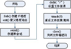 (3)改變當前(qian)目(mu)(mu)錄(lu)(lu)為根目(mu)(mu)錄(lu)(lu)。這一(yi)步(bu)也是必(bi)要(yao)的(de)步(bu)驟(zou)。使(shi)用fork()創建的(de)子進程(cheng)繼承(cheng)了父進程(cheng)的(de)當前(qian)工(gong)作目(mu)(mu)錄(lu)(lu)。由于在進程(cheng)運行(xing)過程(cheng)中(zhong),當前(qian)目(mu)(mu)錄(lu)(lu)所在的(de)文件系(xi)統(如“/mnt/usb”等)是不能卸載的(de),這對以(yi)后的(de)使(shi)用會造成諸多的(de)麻煩(如系(xi)統由于某種原因要(yao)進入單用戶模式)。因此,通常(chang)(chang)的(de)做法是讓(rang)“/”作為守護進程(cheng)的(de)當前(qian)工(gong)作目(mu)(mu)錄(lu)(lu),這樣就(jiu)可以(yi)避免上(shang)述問題。當然,如有特(te)殊需要(yao),也可以(yi)把當前(qian)工(gong)作目(mu)(mu)錄(lu)(lu)換成其他的(de)路徑(jing),如/tmp。改變工(gong)作目(mu)(mu)錄(lu)(lu)的(de)常(chang)(chang)見函數是chdir()。 (4)重(zhong)設(she)(she)文(wen)(wen)件(jian)(jian)(jian)權(quan)(quan)限(xian)掩(yan)碼(ma)。文(wen)(wen)件(jian)(jian)(jian)權(quan)(quan)限(xian)掩(yan)碼(ma)是(shi)指屏蔽掉文(wen)(wen)件(jian)(jian)(jian)權(quan)(quan)限(xian)中的(de)(de)對應位(wei)。例如,有一(yi)個(ge)文(wen)(wen)件(jian)(jian)(jian)權(quan)(quan)限(xian)掩(yan)碼(ma)是(shi)050,它就屏蔽了文(wen)(wen)件(jian)(jian)(jian)組擁有者的(de)(de)可(ke)讀與可(ke)執行權(quan)(quan)限(xian)。由(you)于(yu)使用(yong)fork()函數新(xin)建的(de)(de)子(zi)(zi)進(jin)程(cheng)繼承了父進(jin)程(cheng)的(de)(de)文(wen)(wen)件(jian)(jian)(jian)權(quan)(quan)限(xian)掩(yan)碼(ma),這就給(gei)該子(zi)(zi)進(jin)程(cheng)使用(yong)文(wen)(wen)件(jian)(jian)(jian)帶來了諸(zhu)多(duo)的(de)(de)麻煩。因此,把文(wen)(wen)件(jian)(jian)(jian)權(quan)(quan)限(xian)掩(yan)碼(ma)設(she)(she)置為(wei)0,可(ke)以(yi)大大增強該守護進(jin)程(cheng)的(de)(de)靈活性。設(she)(she)置文(wen)(wen)件(jian)(jian)(jian)權(quan)(quan)限(xian)掩(yan)碼(ma)的(de)(de)函數是(shi)umask()。在(zai)這里,通常的(de)(de)使用(yong)方法為(wei)umask(0)。 (5)關(guan)閉文件描述符。同文件權限掩碼(ma)一樣,用fork()函數新建的(de)子進程(cheng)會從父進程(cheng)那里繼承一些已經打(da)開(kai)的(de)文件。這些被(bei)(bei)打(da)開(kai)的(de)文件可能(neng)永遠不會被(bei)(bei)守護進程(cheng)讀或寫,但它(ta)們(men)一樣消(xiao)耗(hao)系(xi)統資源,而(er)且(qie)可能(neng)導致所在的(de)文件系(xi)統無法被(bei)(bei)卸載。 在(zai)上面的(de)(de)(de)第(2)步之后,守護(hu)進程(cheng)已(yi)(yi)經(jing)與所屬(shu)的(de)(de)(de)控制(zhi)終(zhong)端(duan)(duan)失去了聯系,因此,從(cong)終(zhong)端(duan)(duan)輸入的(de)(de)(de)字符(fu)不可能達到守護(hu)進程(cheng),守護(hu)進程(cheng)中用常規方(fang)法(如(ru)printf())輸出的(de)(de)(de)字符(fu)也不可能在(zai)終(zhong)端(duan)(duan)上顯示出來。所以,文(wen)(wen)件描述符(fu)為0、1和(he)2的(de)(de)(de)3個文(wen)(wen)件(常說的(de)(de)(de)輸入、輸出和(he)報錯這(zhe)3個文(wen)(wen)件)已(yi)(yi)經(jing)失去了存在(zai)的(de)(de)(de)價值,也應被關閉。通常按如(ru)下方(fang)式關閉文(wen)(wen)件描述符(fu):     for(i = 0; i < MAXFILE; i++) 這(zhe)樣,一(yi)個簡單的(de)(de)守護(hu)進程就建立(li)起來了。創(chuang)建守護(hu)進程的(de)(de)流程圖如(ru)圖2所(suo)示。