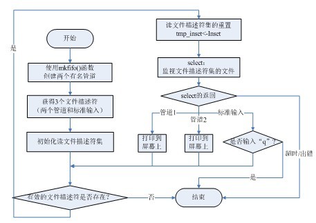 |     本文關鍵字: 有名管道,linux有名管道     1.實驗目(mu)的     通(tong)過(guo)編寫有(you)名管(guan)(guan)道(dao)多(duo)路通(tong)信(xin)實(shi)驗,進一(yi)步掌握管(guan)(guan)道(dao)的創建、讀寫等操(cao)作,同時復習(xi)使用select()函數實(shi)現管(guan)(guan)道(dao)的通(tong)信(xin)。     2.實(shi)驗內容     這(zhe)里采(cai)用(yong)管(guan)道函(han)數(shu)(shu)創(chuang)建有名管(guan)道(并(bing)不(bu)是在控制(zhi)臺下輸入命令),而(er)且使用(yong)select()函(han)數(shu)(shu)替(ti)代poll()函(han)數(shu)(shu)實現多路復(fu)用(yong)(使用(yong)select()函(han)數(shu)(shu)是出于以演示為目(mu)的)。     3.實驗步(bu)驟     (1)畫出流程(cheng)圖。該實(shi)驗(yan)流程(cheng)圖如(ru)圖1所示。  圖1  實驗流程圖