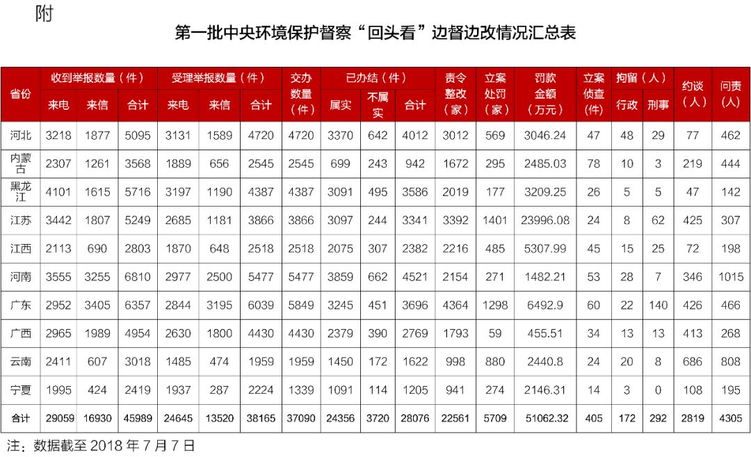 經黨中央、國務院批準,第一批中央環境保護督察“回頭看”6個督察組于2018年5月30日至6月7日陸續對河北、內蒙古、黑龍江、江蘇、江西、河南、廣東、廣西、云南、寧夏等10省(區)實施督察進駐。截至7月7日,全部完成督察進駐工作。