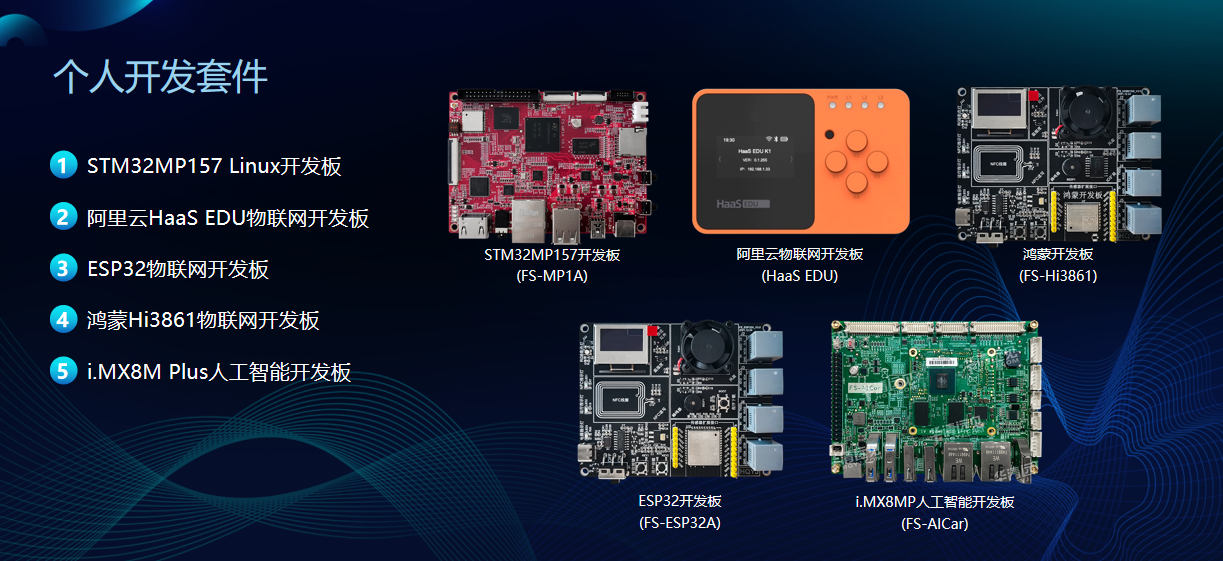 在(zai)個(ge)(ge)人開(kai)(kai)發(fa)(fa)(fa)(fa)套件業(ye)務模塊,華(hua)(hua)清遠(yuan)見(jian)研發(fa)(fa)(fa)(fa)中(zhong)心全新發(fa)(fa)(fa)(fa)布五(wu)款新品——STM32MP157 Linux開(kai)(kai)發(fa)(fa)(fa)(fa)板(ban)、阿里(li)云HaaS EDU物聯(lian)網(wang)開(kai)(kai)發(fa)(fa)(fa)(fa)板(ban)、ESP32物聯(lian)網(wang)開(kai)(kai)發(fa)(fa)(fa)(fa)板(ban)、鴻蒙Hi3861物聯(lian)網(wang)開(kai)(kai)發(fa)(fa)(fa)(fa)板(ban)、i.MX8M Plus人工智(zhi)能(neng)開(kai)(kai)發(fa)(fa)(fa)(fa)板(ban)。這五(wu)款產品中(zhong),濃(nong)縮了(le)阿里(li)、華(hua)(hua)為(wei)、恩智(zhi)浦、ST等名企(qi)前(qian)沿(yan)技(ji)術(shu),不(bu)僅可(ke)以豐富個(ge)(ge)人愛好者的(de)開(kai)(kai)發(fa)(fa)(fa)(fa)體驗(yan),在(zai)項目技(ji)術(shu)上也(ye)到達了(le)一個(ge)(ge)新的(de)高度。