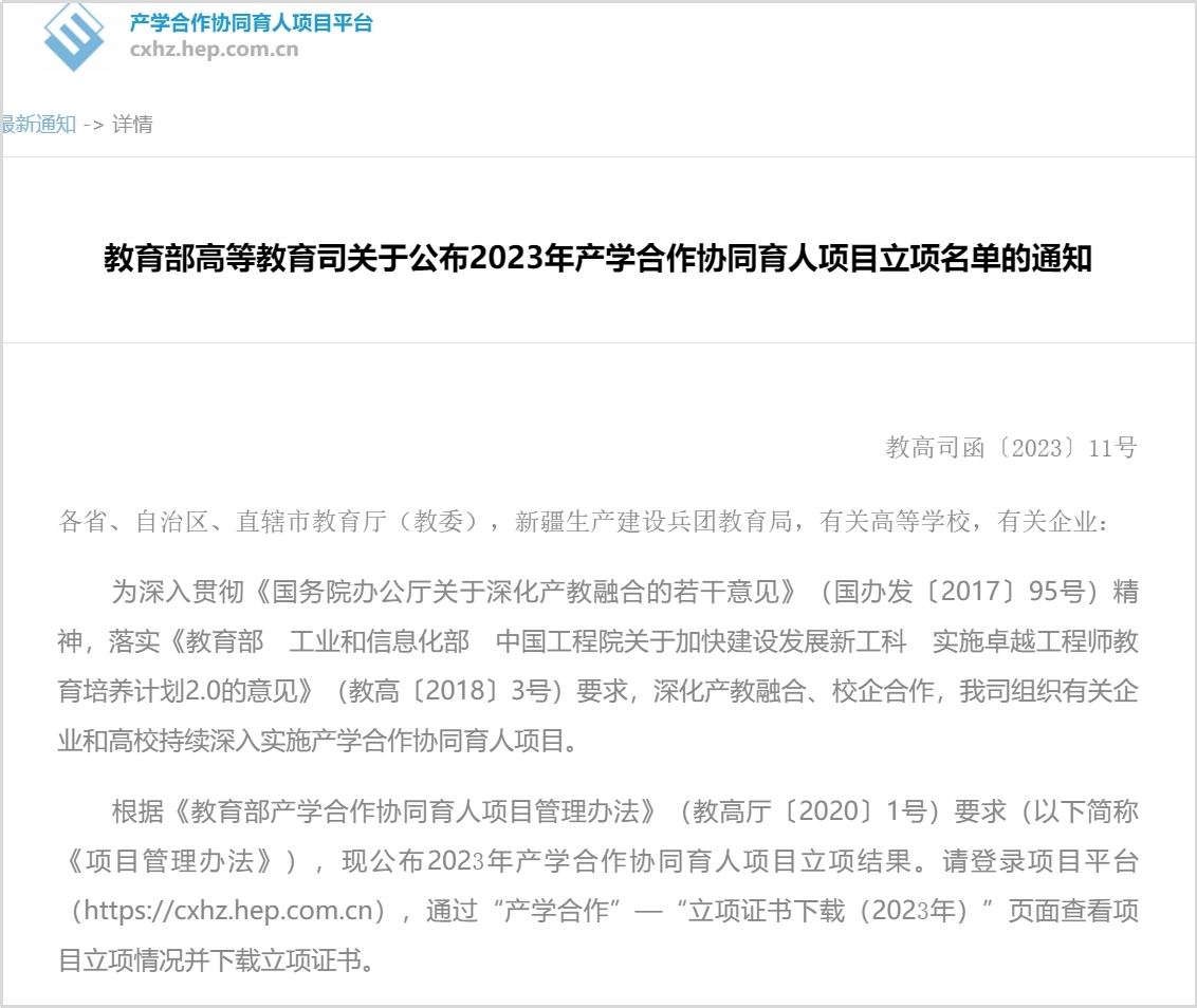 [華清遠見(jian)]華清遠見(jian)關于教育(yu)部高教司2023年產(chan)學合(he)作(zuo)協同育(yu)人項(xiang)目獲批立項(xiang)名單(dan)公(gong)布