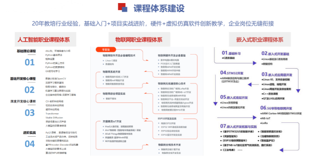 華清遠見教(jiao)育(yu)科技(ji)集團扎根IT職業教(jiao)育(yu)20載,始終(zhong)牢記為培養具(ju)有持續競爭(zheng)力(li)的(de)新一(yi)(yi)代(dai)信息技(ji)術高端(duan)產(chan)業人才而(er)努力(li)”的(de)企業使(shi)命,用心打磨人工(gong)智能、嵌(qian)入式、物聯(lian)網等一(yi)(yi)系(xi)列高端(duan)IT課程,提供分層教(jiao)學服務,適(shi)用于(yu)基礎(chu)薄弱、IT轉行、在職提升等多類型人群。