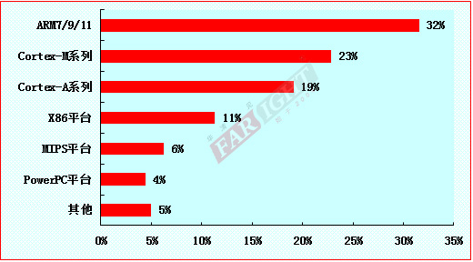從2012-2013年度的(de)(de)(de)(de)(de)(de)調查統計數(shu)據中可以看到, ARM處理(li)(li)(li)器(qi)(qi)(包括ARM7/9/11、Cortex-M系列、Cortex-A系列)毫無疑問地占據了嵌入式(shi)處理(li)(li)(li)器(qi)(qi)絕大部分(fen)的(de)(de)(de)(de)(de)(de)市場(chang)份(fen)額(e)(74%),在ARM及(ji)其(qi)(qi)合(he)作伙伴的(de)(de)(de)(de)(de)(de)市場(chang)推動(dong)下(xia),ARM7/9/11較(jiao)(jiao)前一(yi)年的(de)(de)(de)(de)(de)(de)統計結果,出現(xian)了非常明顯的(de)(de)(de)(de)(de)(de)下(xia)滑,市場(chang)份(fen)額(e)下(xia)降了13個百分(fen)點,而新ARMv7架構的(de)(de)(de)(de)(de)(de)Cortex系列處理(li)(li)(li)器(qi)(qi)成(cheng)功布(bu)局(ju)嵌入式(shi)移動(dong)計算領域并取(qu)得(de)了快(kuai)速的(de)(de)(de)(de)(de)(de)發展,其(qi)(qi)中定位低(di)(di)端的(de)(de)(de)(de)(de)(de)Cortex-M系列處理(li)(li)(li)器(qi)(qi)和定位高(gao)端的(de)(de)(de)(de)(de)(de)Cortex-A處理(li)(li)(li)器(qi)(qi)較(jiao)(jiao)一(yi)年前的(de)(de)(de)(de)(de)(de)統計結果,分(fen)布(bu)有兩個百分(fen)點的(de)(de)(de)(de)(de)(de)增(zeng)長,已毋(wu)庸(yong)置(zhi)疑地成(cheng)為(wei)ARM處理(li)(li)(li)器(qi)(qi)應(ying)用的(de)(de)(de)(de)(de)(de)主流。隨(sui)著物聯網產業的(de)(de)(de)(de)(de)(de)快(kuai)速發展,對低(di)(di)功耗(hao)微控制器(qi)(qi)的(de)(de)(de)(de)(de)(de)需求必然會更進(jin)一(yi)步地推動(dong)Cortex-M系列處理(li)(li)(li)器(qi)(qi)的(de)(de)(de)(de)(de)(de)快(kuai)速應(ying)用,而高(gao)性能智能手機、平板(ban)電腦及(ji)更多智能終端設(she)備的(de)(de)(de)(de)(de)(de)開速普及(ji)則使得(de)Cortex-A系列處理(li)(li)(li)器(qi)(qi)獲得(de)了快(kuai)速發展的(de)(de)(de)(de)(de)(de)機會。