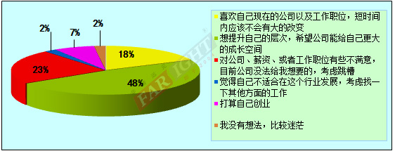 在2012-2013年度的(de)(de)(de)調(diao)查統計(ji)結果中(zhong)(zhong),“對未來職(zhi)業人(ren)生的(de)(de)(de)規劃”一項(xiang),接近66%的(de)(de)(de)工(gong)(gong)程(cheng)(cheng)(cheng)師(shi)給予了(le)肯定(ding)的(de)(de)(de)評價,其中(zhong)(zhong)48%的(de)(de)(de)工(gong)(gong)程(cheng)(cheng)(cheng)師(shi)表示希望(wang)提(ti)升自(zi)己(ji)的(de)(de)(de)層次(ci),期(qi)待目前所在公司(si)能(neng)給自(zi)己(ji)更(geng)大(da)(da)的(de)(de)(de)成(cheng)長空間(jian) 。18%的(de)(de)(de)工(gong)(gong)程(cheng)(cheng)(cheng)師(shi)則表示喜歡自(zi)己(ji)現(xian)在的(de)(de)(de)公司(si)以(yi)及工(gong)(gong)作職(zhi)位(wei),短時間(jian)內應該不(bu)會有(you)(you)較大(da)(da)的(de)(de)(de)改變(bian)。考慮跳(tiao)槽的(de)(de)(de)工(gong)(gong)程(cheng)(cheng)(cheng)師(shi)所占(zhan)比例為(wei)(wei)23%,比去(qu)年上升了(le)4個百分(fen)點,打算自(zi)己(ji)創業的(de)(de)(de)為(wei)(wei)7%,其他選(xuan)項(xiang)均占(zhan)較小比例。對比去(qu)年同期(qi)的(de)(de)(de)數據,我們不(bu)難看(kan)出,由于行業內專業人(ren)才的(de)(de)(de)持續緊缺,嵌入式(shi)研發工(gong)(gong)程(cheng)(cheng)(cheng)師(shi)在職(zhi)業發展上擁有(you)(you)更(geng)多(duo)的(de)(de)(de)主動選(xuan)擇(ze)權。