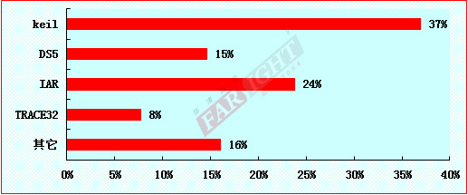 軟件開(kai)發(fa)調試工(gong)具(ju)(ju)的(de)(de)選(xuan)擇(ze)為(wei)(wei)本(ben)年度新(xin)增調研(yan)項(xiang)目,調查(cha)統(tong)計的(de)(de)數據結(jie)果顯示,keil和IAR分(fen)別以37%、24%的(de)(de)比例成為(wei)(wei)嵌(qian)入(ru)式開(kai)發(fa)者的(de)(de)主要調試工(gong)具(ju)(ju),總(zong)計占所有(you)參與調研(yan)人數的(de)(de)61%。合適的(de)(de)調試工(gong)具(ju)(ju)的(de)(de)選(xuan)擇(ze)使用,可以大大加(jia)快產品的(de)(de)開(kai)發(fa)進度。這(zhe)也(ye)使得在調試工(gong)具(ju)(ju)層(ceng)面的(de)(de)技術支持和發(fa)展成為(wei)(wei)研(yan)發(fa)過程中需要考(kao)慮的(de)(de)因素之(zhi)一。同時,這(zhe)個(ge)調查(cha)結(jie)果也(ye)為(wei)(wei)初學者如(ru)何選(xuan)擇(ze)開(kai)發(fa)工(gong)具(ju)(ju)提供有(you)價值的(de)(de)參考(kao)。