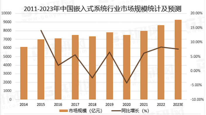 首先傳統嵌入式電子產品的盈利模式還是以技術和設備作為買點,隨著互聯網的普及傳統技術傳統技術也在極大程度上進行了傳播,被更多的人熟知,并且隨著科技的發展設備端的開發成本也在下降。所以從市場的角度去分析,傳統嵌入式電子產品已經不適合以技術和設備作為買點進行盈利。同時當代社會需求也在轉變,十九大報告指出,中國特色社會主義進入新時代,我國社會主要矛盾已經轉化為人民日益增長的美好生活需要和不平衡不充分的發展之間的矛盾。正確認識和把握這個新的重大政治論斷,對于深刻理解中國發展新的歷史方位具有重要意義。美好生活涉及民生的各個方面,為滿足社會需求,嵌入式行業也在發生著轉型,向著服務型市場方向轉變,在極大程度上為各個行業領域的人們進行服務,比如農業領域的智能灌溉系統、安全領域的智能安防、工業領域的智能控制、教育領域的智慧校園等等,讓設備或機器在最大程度上幫著人們完成一些任務,那么嵌入式電子產品就要向著更高算力、更小體積、更低功耗方向發展,只要社會發展、科技發展嵌入式電子產品也會隨著社會需求進行發展,2011-2023年中國嵌入式系統行業市場規模統計及預測如下圖所示,呈逐年增長趨勢。