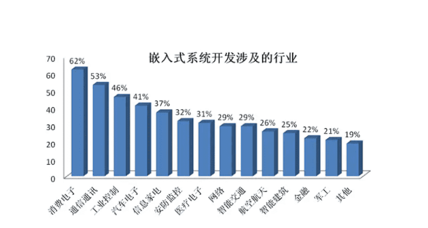 嵌入式電子產品,指供日常消費者生活使用的電子產品,開發或嵌入式系統開發主要涉及的行業如上圖所示,主要產業集群還是在消費電子領域,消費電子領域對于TO-C的用戶比較多,面向廣大用戶,由于面向用戶多,所以行業占比也比較高。