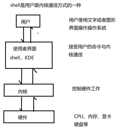 簡單點理解,用戶直接面對的是shell,用戶把指令告訴shell,然后shell再傳輸給系統內核,接著內核再去支配計算機硬件去執行各種操作。