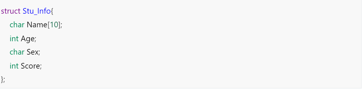 例如:創建一個學生信息(Stu_Info)的結構體,成員:名字(Name)、年齡(Age)、性別(Sex)、成績(Score)。則結構體的一般定義如下: