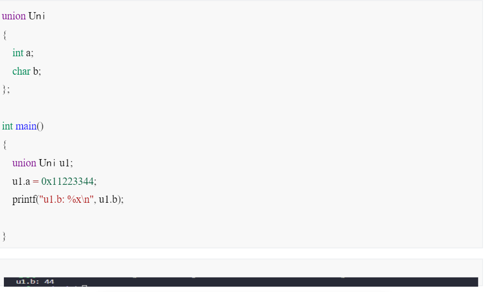 由這個示例可驗證共用體Uni的成員a、b是共用存儲空間的,我們可以采用這種方式獲取計算機的存儲方式(大小端序)。