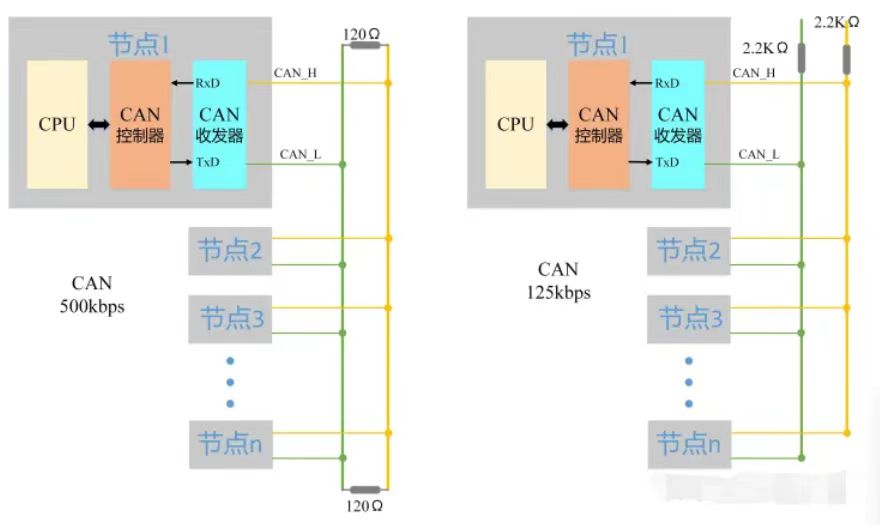 無論哪種結構,通信設備只需要用兩條線路對應連接到CAN_H和CAN_L線上。