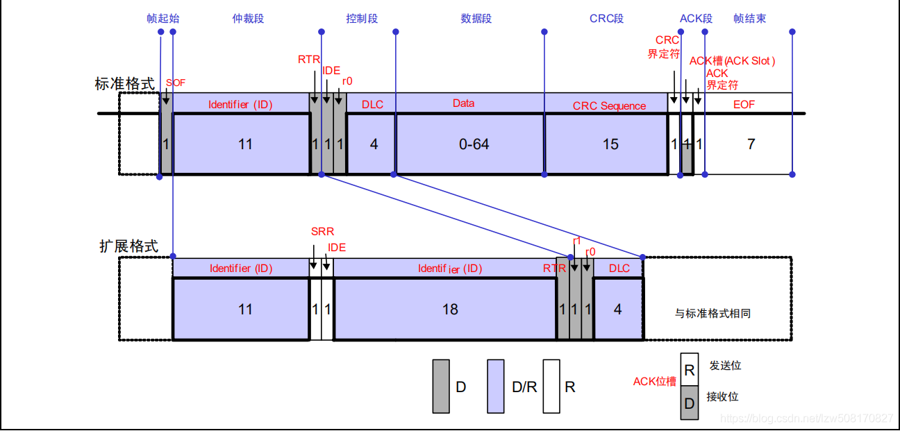 例如,CAN總線規定了數據幀、遙控幀、錯誤幀、過載幀、幀間隔等不同類型的幀。其中,數據幀又分為標準幀和擴展幀。CAN總線協議規定數據幀的結構為:幀起始,仲裁段、控制段、數據段、CRC段、ACK段、幀結束,且對各段,都做了規定。
