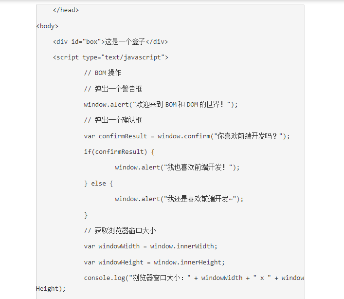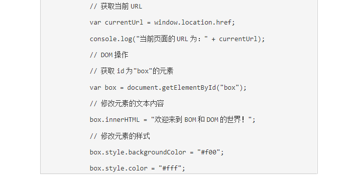 使用DOM的getElementById方法獲取了id為"box"的元素,并進行了文本修改、樣式修改、元素創建、屬性獲取和事件監聽等操作。