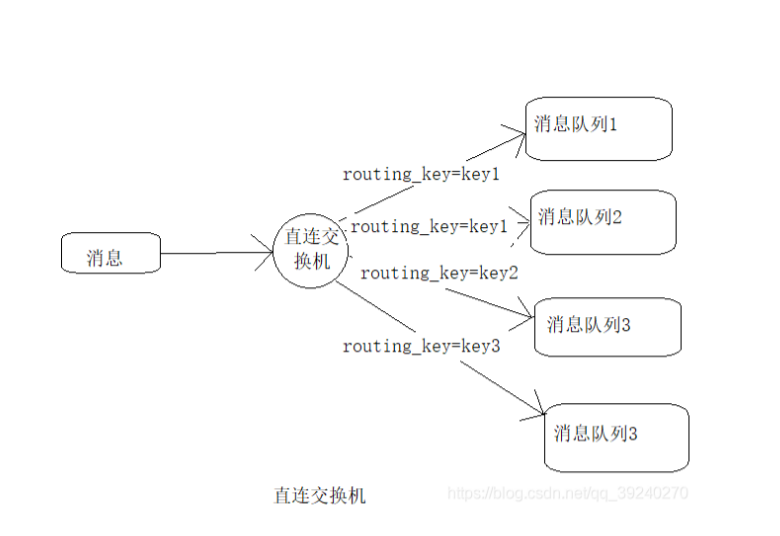 直連交換機是一種帶路由功能的交換機,一個隊列會和一個交換機綁定,除此之外再綁定一個routing_key,當消息被發送的時候,需要指定一個binding_key,這個消息被送達交換機的時候,就會被這個交換機送到指定的隊列里面去。同樣的一個binding_key也是支持應用到多個隊列中的。 這樣當一個交換機綁定多個隊列時,就會被送到對應的隊列去處理。