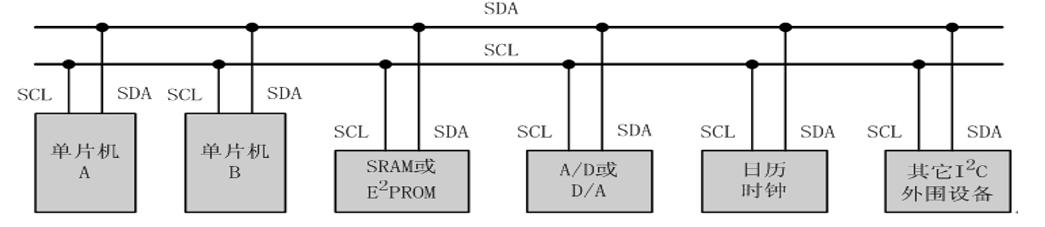 I2C總線只使用兩條雙向漏極開路的信號線(串行數據線:SDA,及串行時鐘線:SCL),并利用電阻上拉。