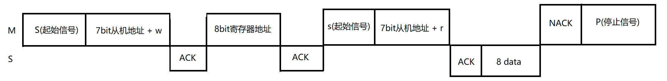 開始通訊時,主設備先發送一個起始信號(S),主設備發送一個地址數據(由7bit的從設備地址,和最低位的寫標志位組成的8bit字節數據), 然后,主設備釋放SDA線,并等待從設備的應答信號(ACK),從設備應答主設備后,主設備再發送要讀取的寄存器地址,從設備應答主設備(ACK), 主設備再次發送起始信號(Sr),主設備發送設備地址(包含讀標志),從設備應答主設備,并將該寄存器的值發送給主設備;