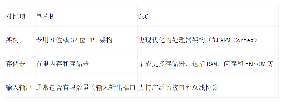 下面是單片機(MCU)和系統級芯片(SoC)的對比表格: