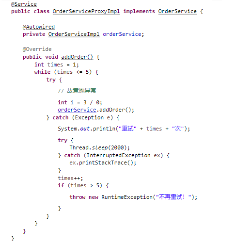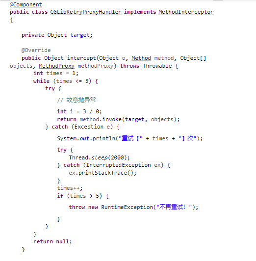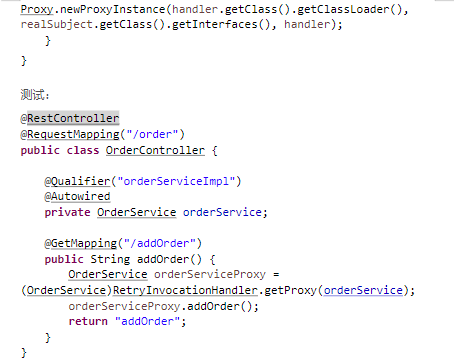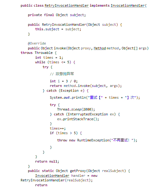 這樣,重試邏輯就都由代理類來完成,原業務類的邏輯就不需要修改了,以后想修改重試邏輯也只需要修改這個類就行了。