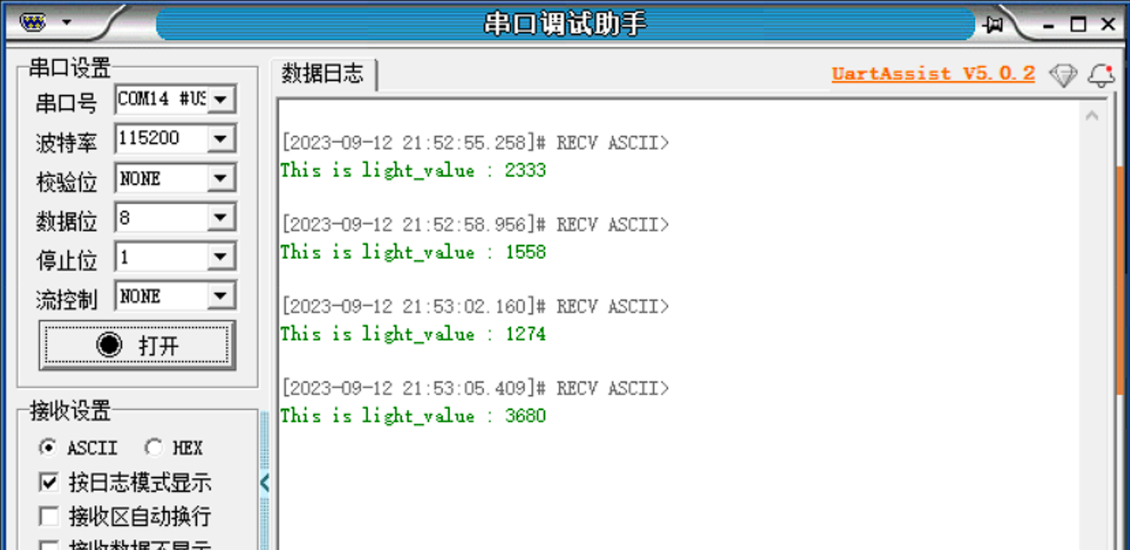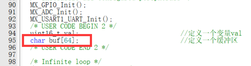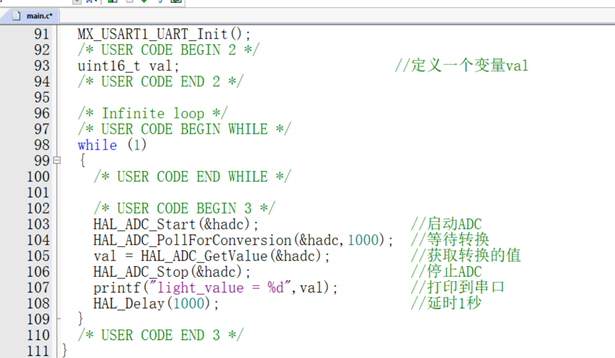 3)編寫代碼,定義一個變量接收ADC轉換的值,再將其打印至串口進行調試輸出