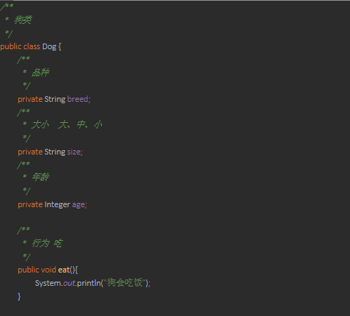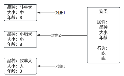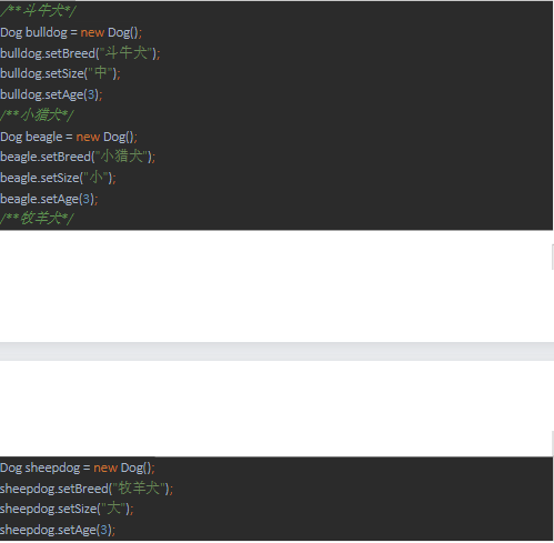 狗類是具體具體狗的一個模板,定義了不同品種狗共有的屬性和行為,斗牛犬、小獵犬、牧羊犬是具體狗的品種,是狗類的具體對象,具備具體的特征和行為。將狗類及其對象(具體品種)用Java語言表達如下: