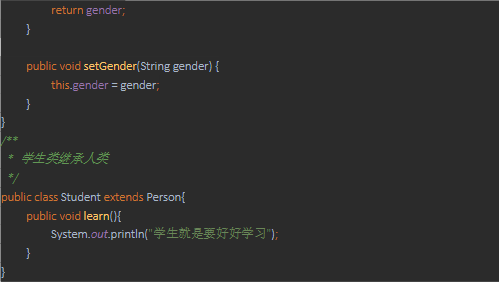 再看繼承。子類繼承父類的特征和行為,使得子類對象(實例)具有父類的實例域和方法,或子類從父類繼承方法,使得子類具有父類相同的行為。比如以下例子,學生類繼承了人類,學生類就擁有了人類定義的屬性。