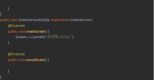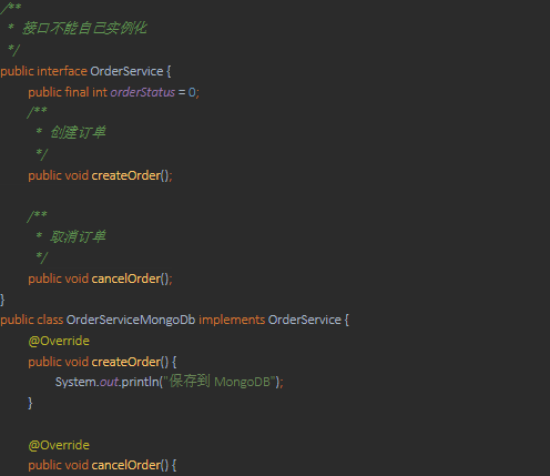最后看多態。多態特性是指同一個行為具有多個不同表現形式或形態的能力,Java中主要表現為重載和重寫。比如以下的例子,訂單保存動作可以選擇保存到MongoDB或者MySQL,即一個保存動作,可以將訂單信息保存到不同的數據庫。