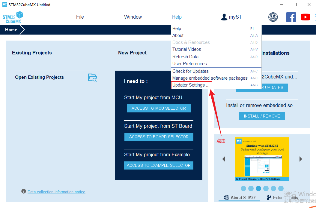 1、軟件安裝完成后,點擊HELP選擇Updater Settings,配置固件存放的路徑,并將自動更新檢查關掉,如下圖所示。設置完成后點擊OK。