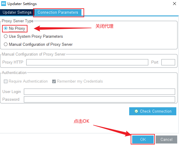 2、在Updater Settings選項下,點擊Connection Parameters,點擊NoProxy將代理關掉,如下圖所示。設置完成后點擊OK。