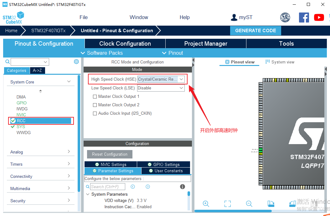 5、選擇RCC,開啟外部高速時鐘。