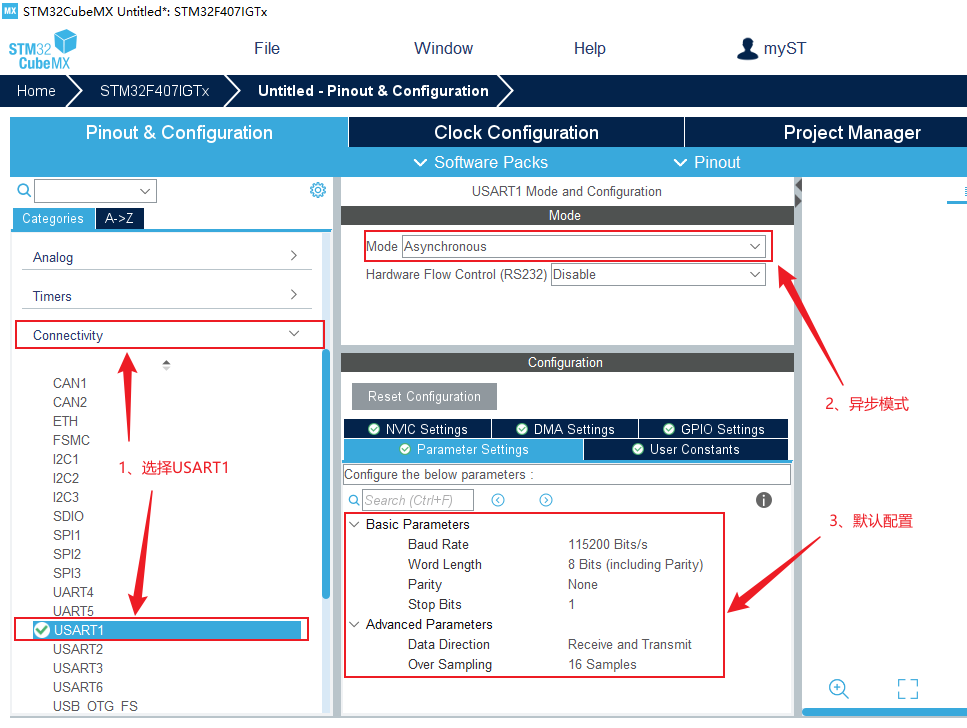 6、選擇USART1串口,在mode下配置為異步模式,通信參數使用默認配置即可。