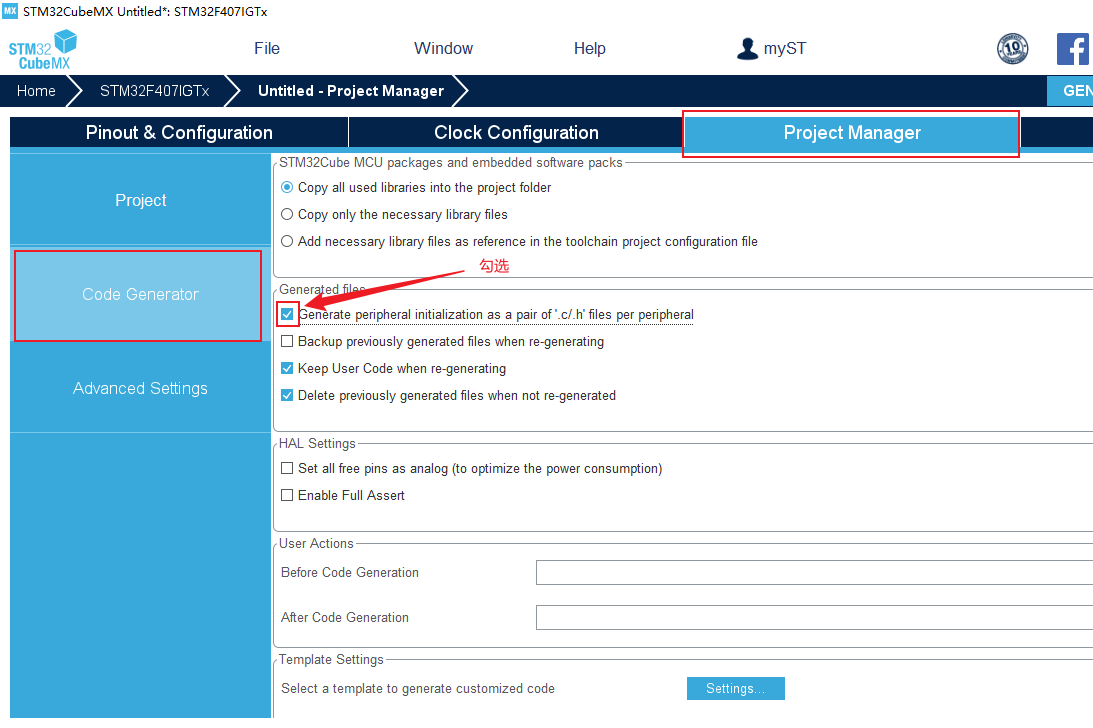 8、點擊Project Manager對工程文件進行管理,點擊Code Generator將Generate peripheral initialization as a pair of ".c/.h' files per peripheral勾選,選項這樣可以獨立生成對應外設的初始化.h和.c 文件