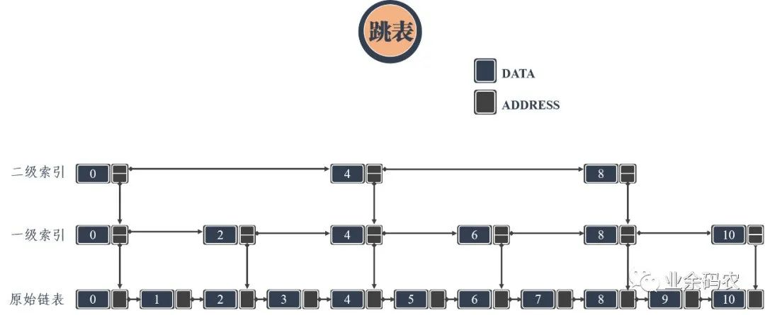 從上圖可以看出,索引級的指針域除了指向下一個索引位置的指針,還有一個down指針指向低一級的鏈表位置,這樣才能實現跳躍查詢的目的。